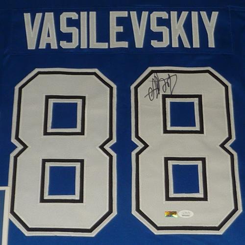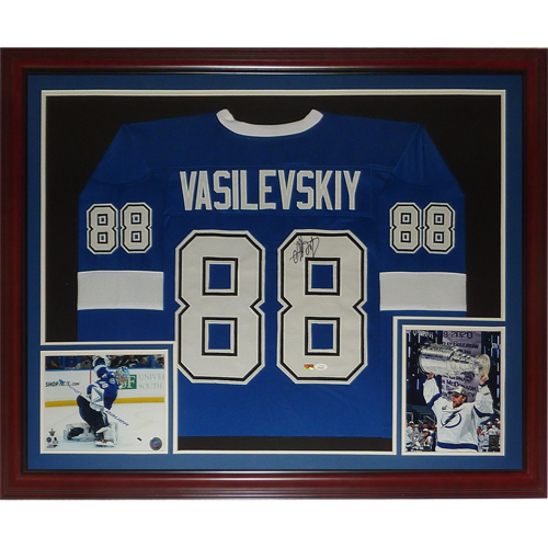 Get your hands on this deluxe framed jersey of Tampa Bay Lightning's very own Andrei Vasilevskiy! This autographed #88 jersey is a must-have for any true fan. With JSA authentication, you can be sure of its authenticity. Don't miss this opportunity to own a piece of Lightning history. The total frame dimensions measure 44"x 36"