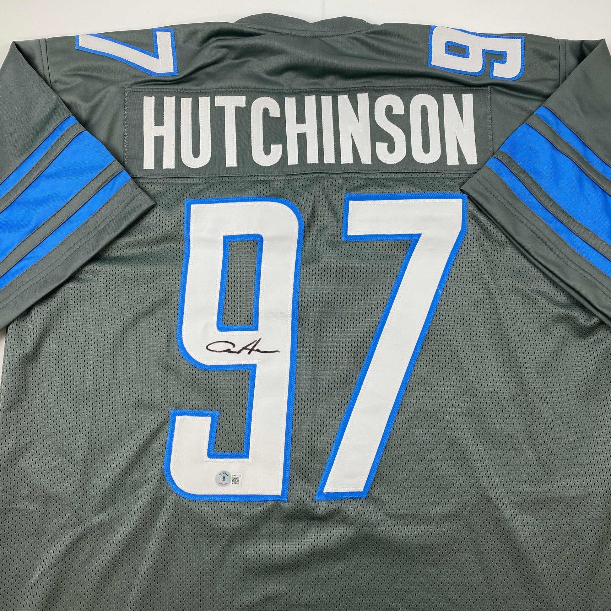 Autographed/Signed Aidan Hutchinson Detroit Grey Football Jersey Beckett BAS COA