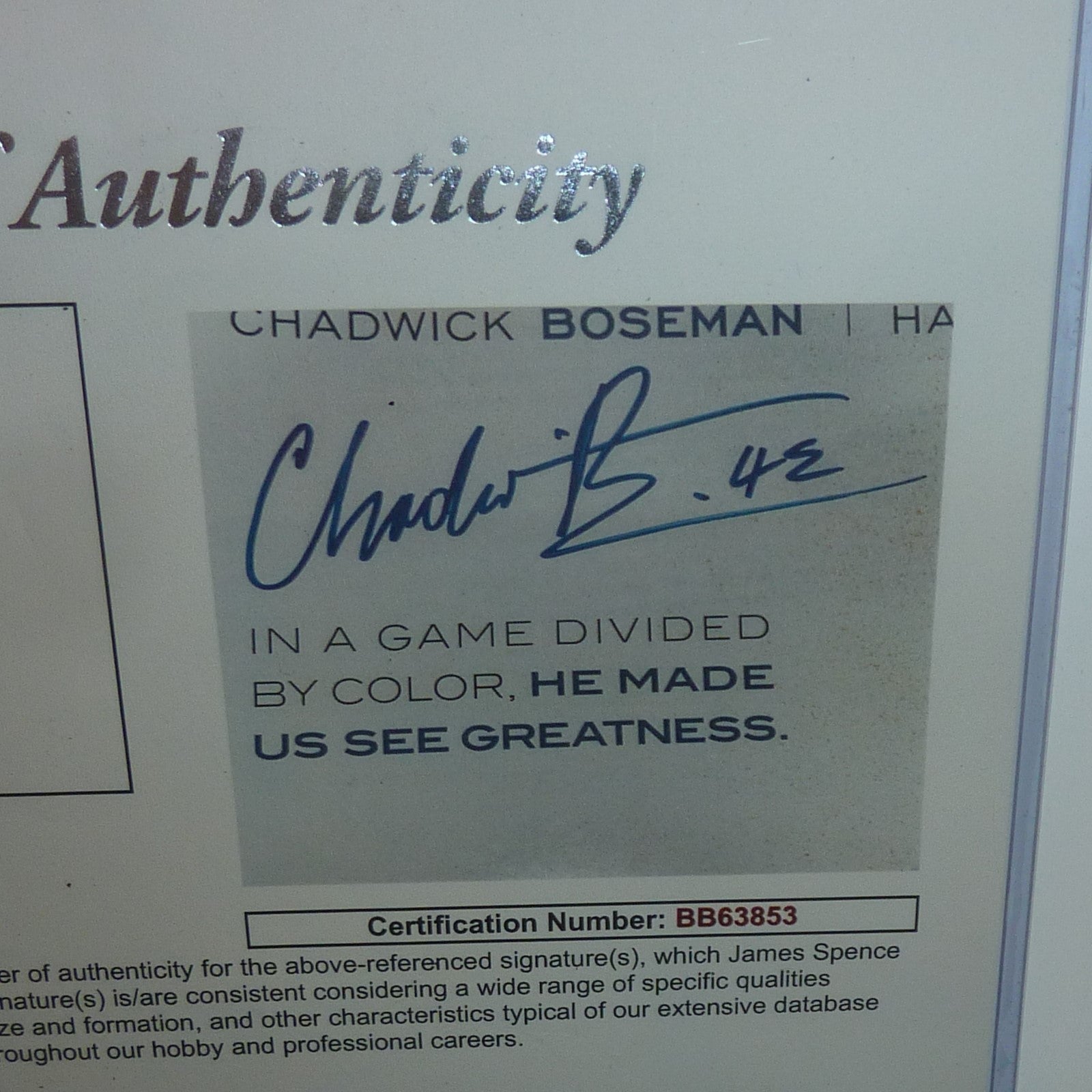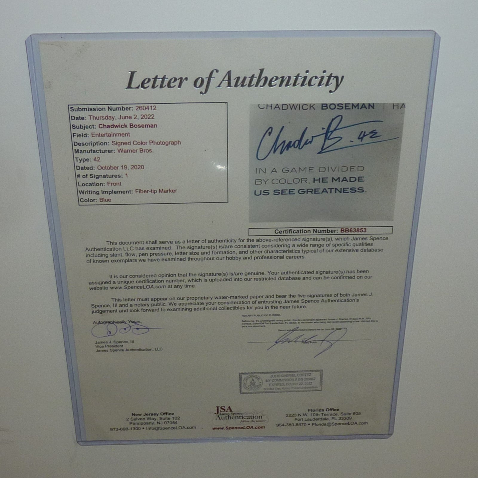 Embrace the power of Wakanda with this deluxe framed Black Panther movie poster, adorned with an authentic Chadwick Boseman autograph. Expertly authenticated by JSA, this full-size poster is a must-have for any true fan. Show your support for the iconic hero and bring the magic of Wakanda into your home. Total frame dimensions are 34x44.