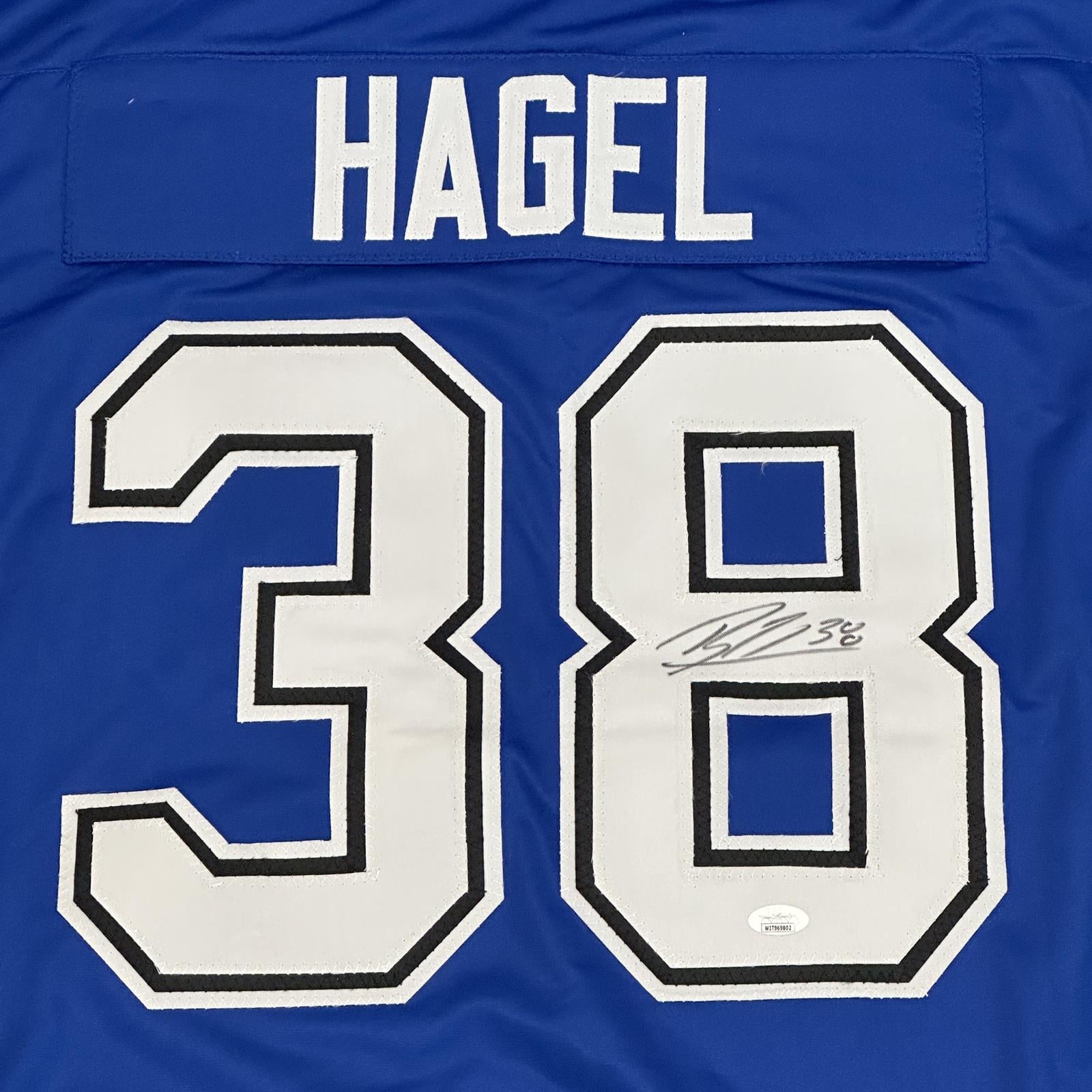 This stitched hockey jersey was hand signed by Tampa Bay Lightning star Brandon Hagel at a private signing. It is accompanied by a Certificate of Authenticity from JSA. It is a pro-style custom stitched jersey with no Team logos or league markings. A tamper-evident hologram will be affixed to the item. Each signature is witnessed by a member of our staff or comes out of a private signing.