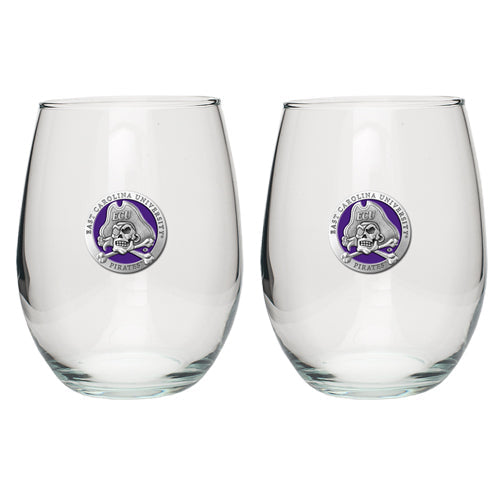 This is a set of two 12 ounce glass goblets with a fine pewter logo medallion bonded to the side. It could be used to serve water, wine or other beverages. Made in USA.