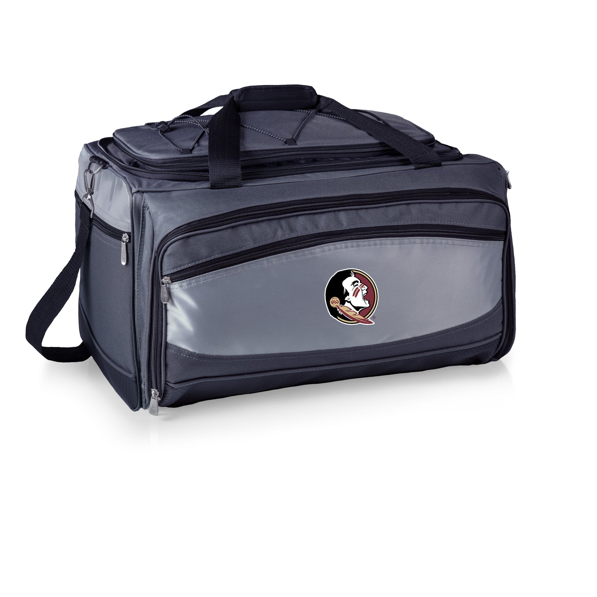 Picnic Time is proud to introduce our patented Florida State Seminoles Buccaneer Portable Charcoal Grill & Cooler Tote, a travel grill set and insulated cooler in one! A 24-can capacity, fully-removable cooler nestles securely into the main compartment which holds the bbq grill and lid, and an exterior zip-up compartment holds three stainless steel grilling tools with aluminum handles and non-slip thumb grips including: one large spatula with an integrated bottle opener, one bbq fork, and tongs. With an adjustable shoulder strap with comfort pad, a reinforced waterproof base, three large zippered exterior pockets to store personal effects, padded carry handles, and a stretch cargo cord on the top of the tote to carry a blanket or towel, you'll win the tailgate party, hands down!
