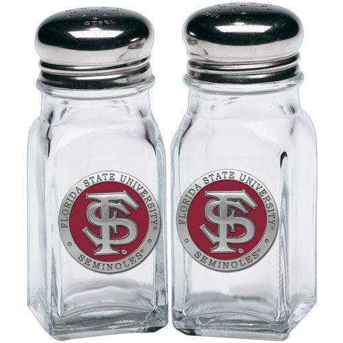 This is a set of salt & pepper shakers with a fine pewter logo medallion bonded to the side. Made in USA.