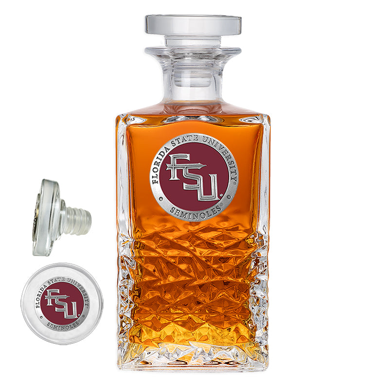 This 25 ounce glass decanter is embellished with a fine pewter casting. Be sure to match it with some of our Double Old Fashioned glasses. A great addition to any home bar!