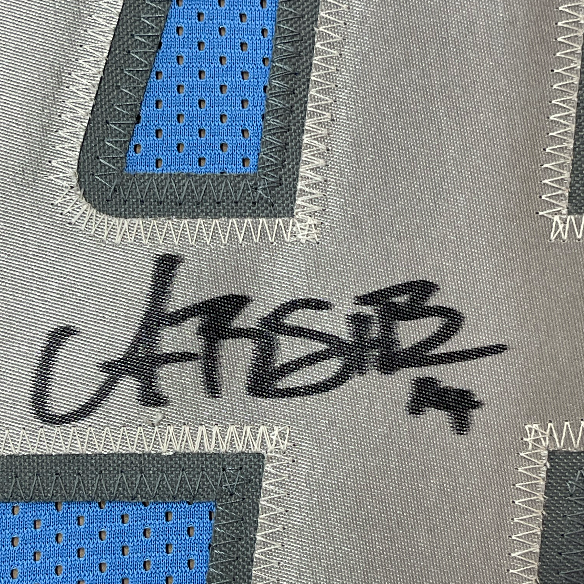 Framed Autographed/Signed Amon-Ra St. Brown 35x39 Detroit Blue Football Jersey Beckett BAS COA