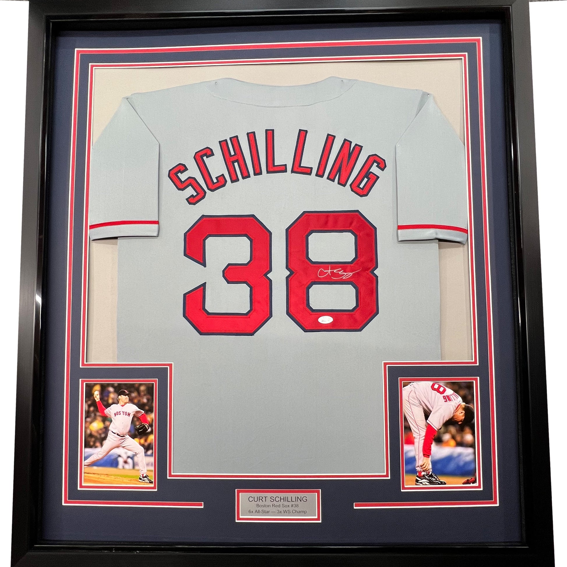 Framed Autographed/Signed Curt Schilling 35x39 Boston Grey Baseball Jersey JSA COA