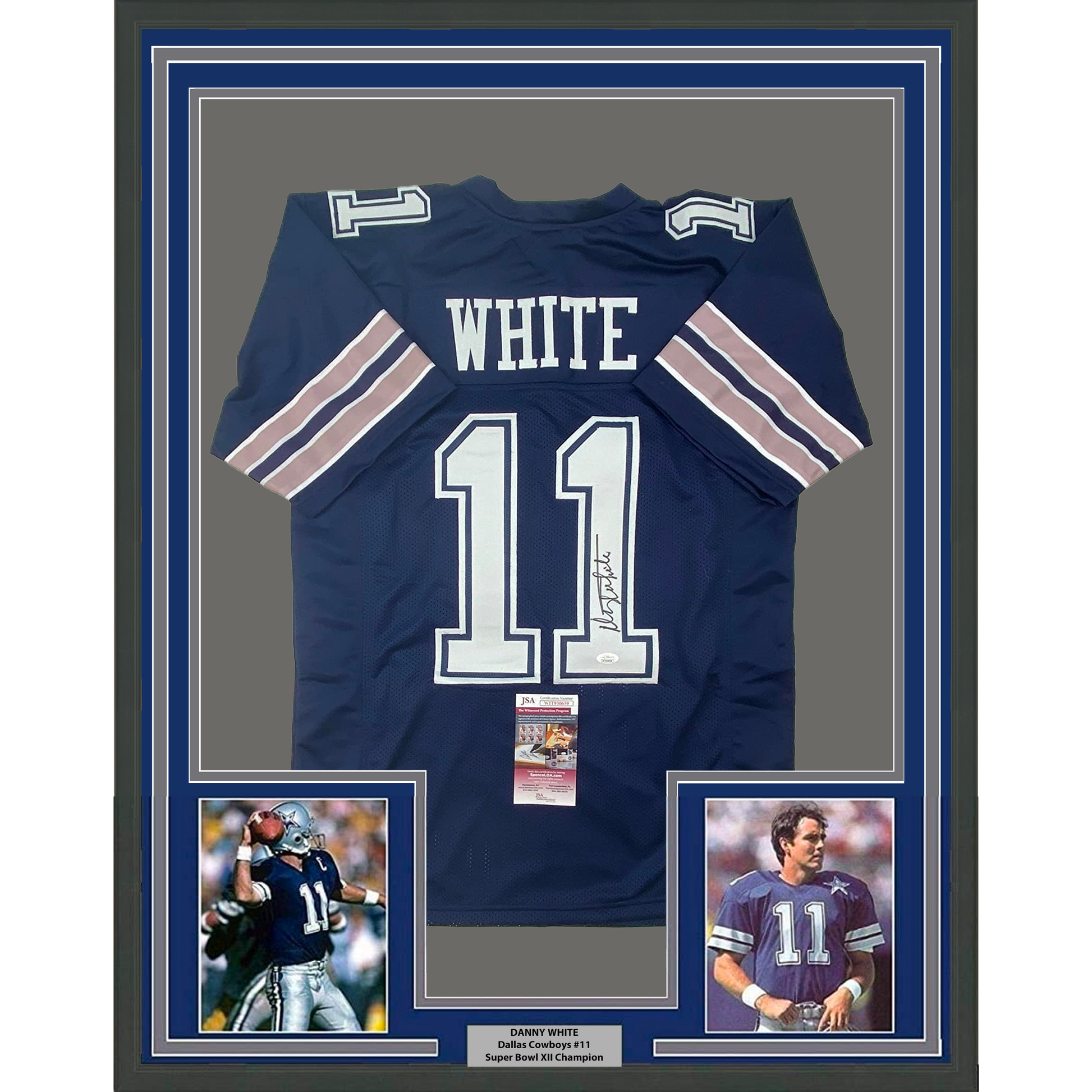 Framed Autographed/Signed Danny White 35x39 Dallas Dark Blue Football Jersey JSA COA