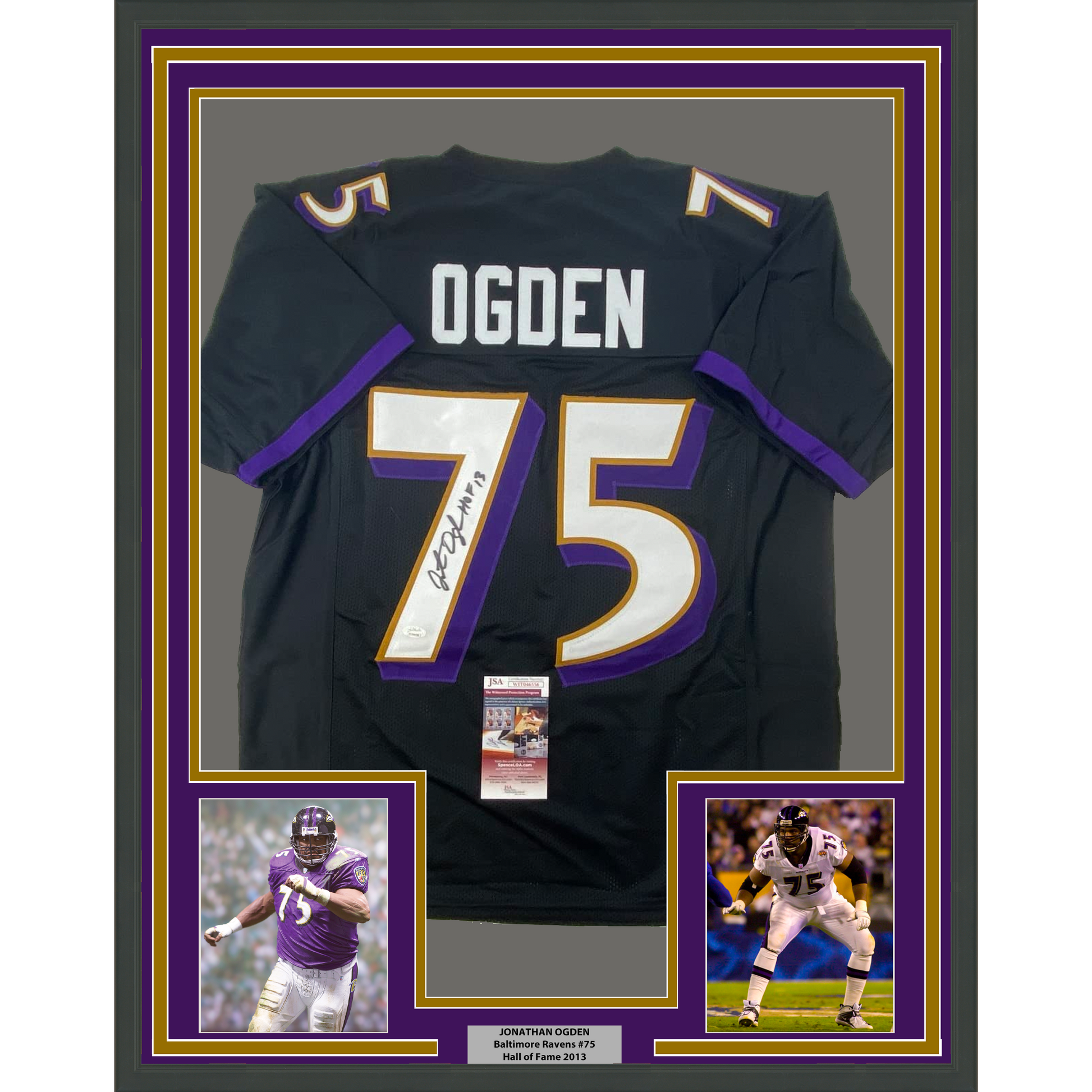 Framed Autographed/Signed Jonathan Ogden 35x39 HOF 13 Baltimore Black Football Jersey JSA COA