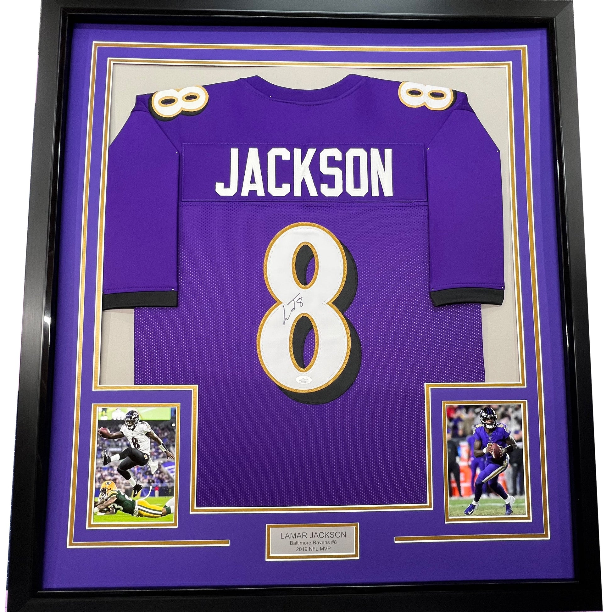 Framed Autographed/Signed Lamar Jackson 35x39 Baltimore Purple Football Jersey JSA COA