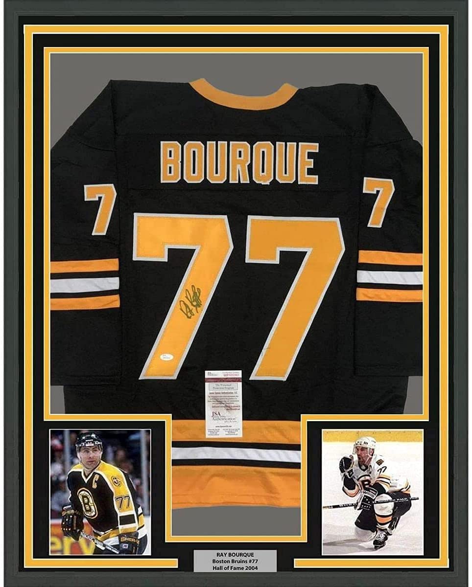 Framed Autographed/Signed Ray Bourque 35x39 Boston Black Hockey Jersey JSA COA