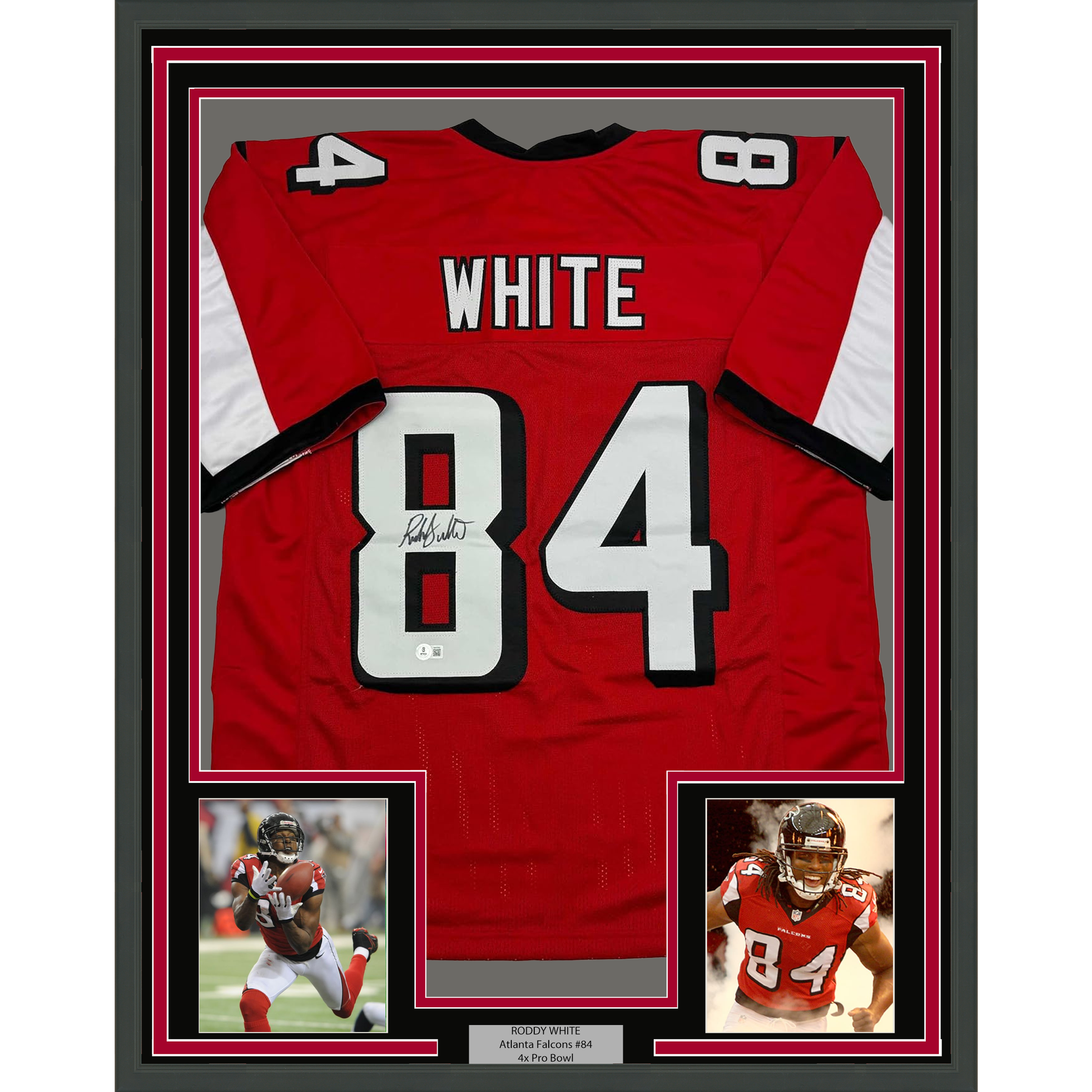 Framed Autographed/Signed Roddy White 35x39 Atlanta Red Football Jersey Beckett BAS COA