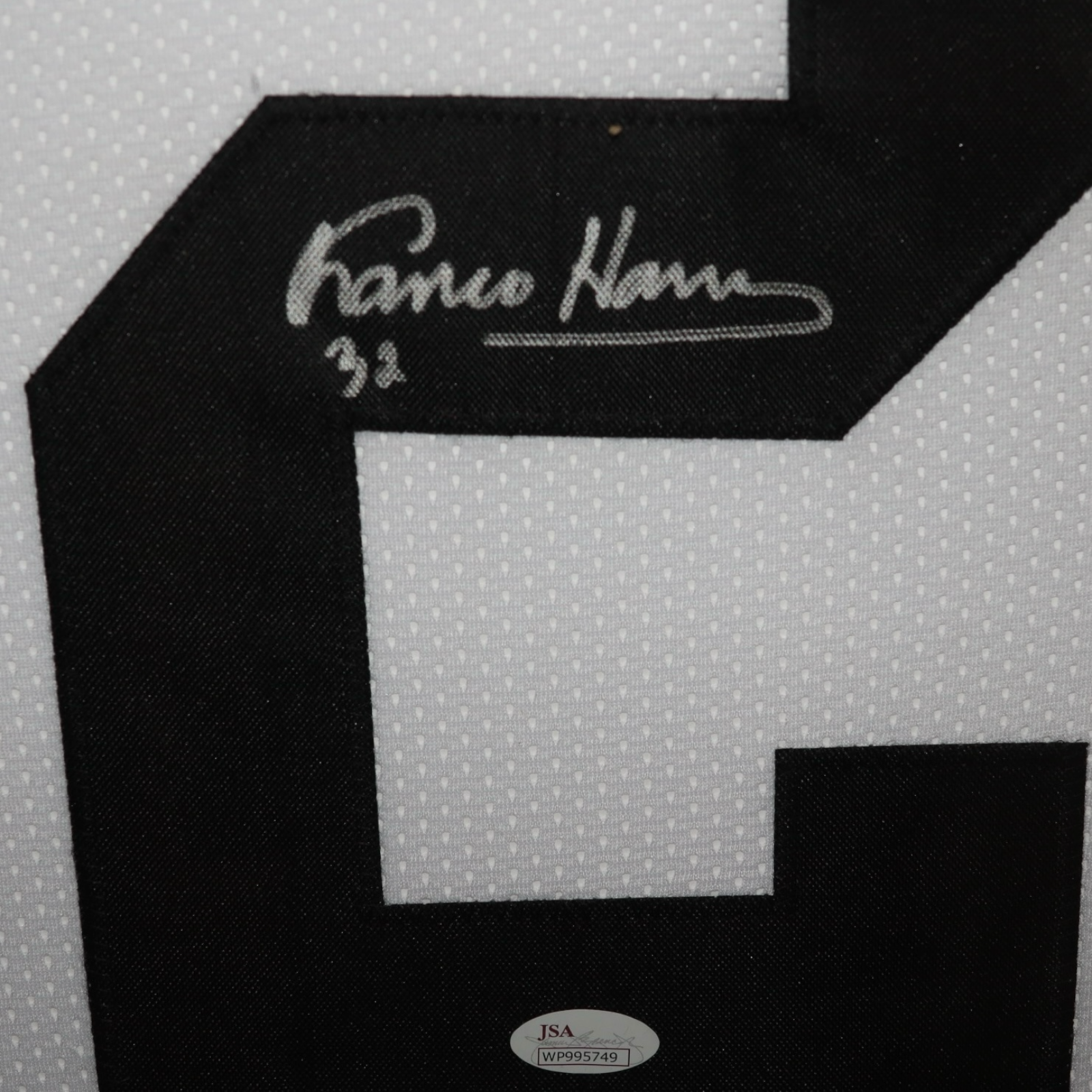 Celebrate your love for Pittsburgh with this deluxe framed jersey signed by the legendary Franco Harris. This JSA authenticated signature features Harris' iconic #32 in white. A must-have for any fan or collector, this jersey brings the thrill of the game into your home and showcases your passion for the team. The total frame dimensions measure 36x44.
