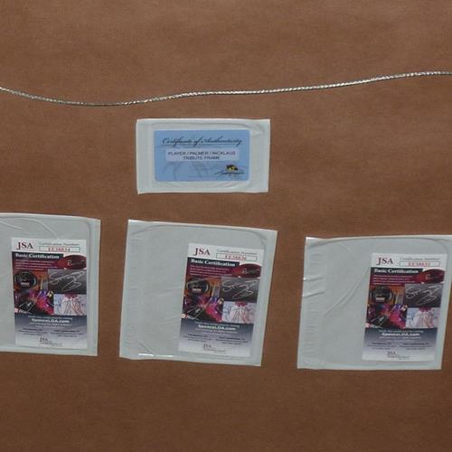 This deluxe framed golf piece features autographs from the legendary "Big 3" golfers: Jack Nicklaus, Arnold Palmer, and Gary Player. Certified by JSA, this piece is a must-have for any golf enthusiast. Showcase this iconic trio in your home or office and elevate your golf collection to the next level.