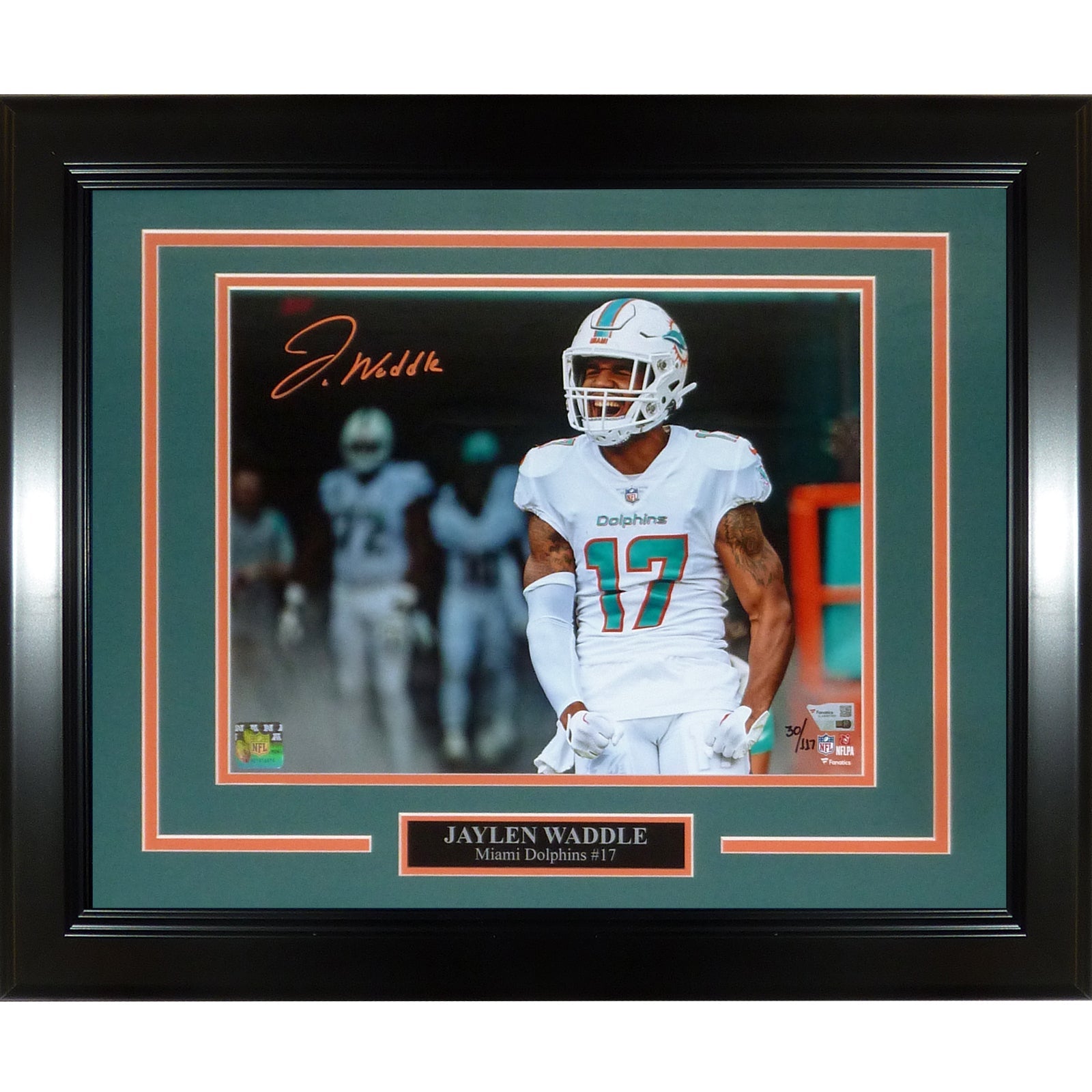 Introducing the ultimate addition to your Miami Dolphins fan collection: the Jaylen Waddle Autographed Deluxe Framed 11x14 Photo! This must-have piece features a bold intro shot of the star player, personally signed and authenticated by Fanatics. Show off your passion for the team in style with this unique item.