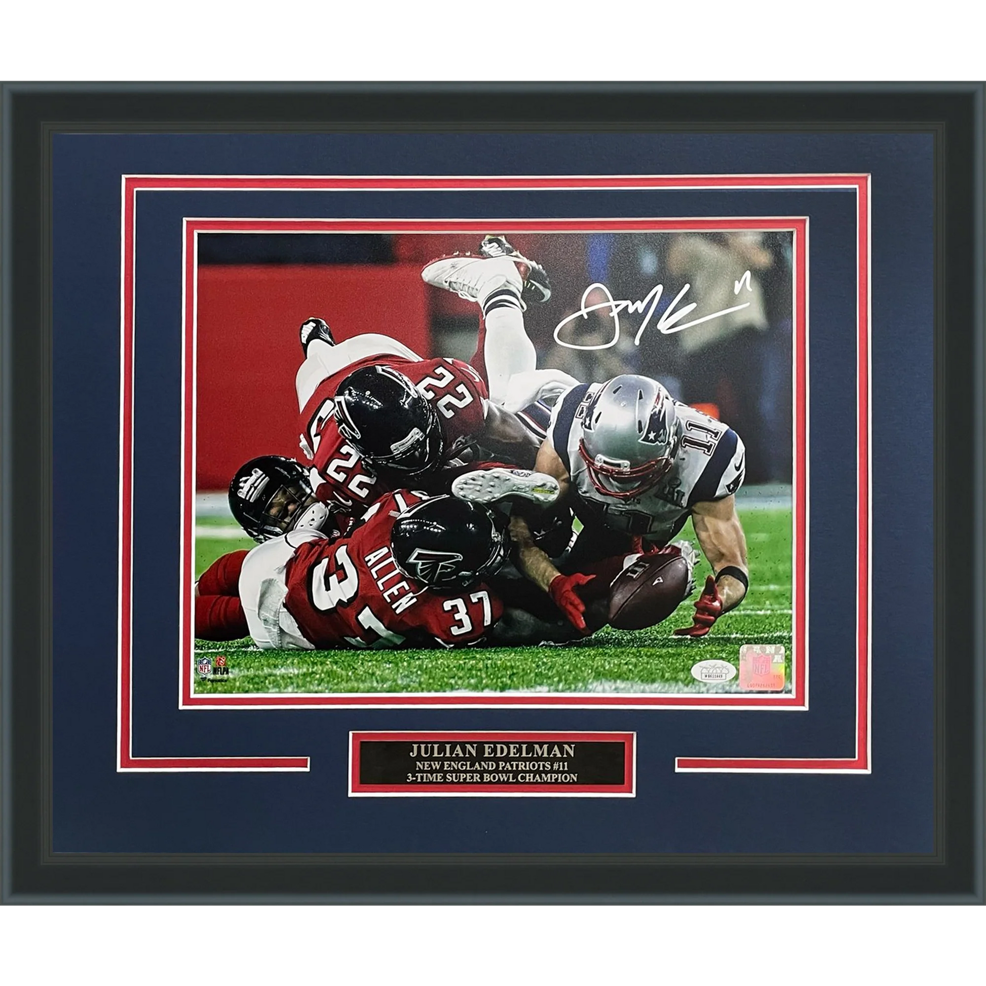 Own a piece of New England Patriots history with this Julian Edelman autographed deluxe framed 11x14 photo. This stunning photo captures Edelman's iconic Super Bowl LI catch. Display it proudly in your home or office and relive the magic of this unforgettable moment.