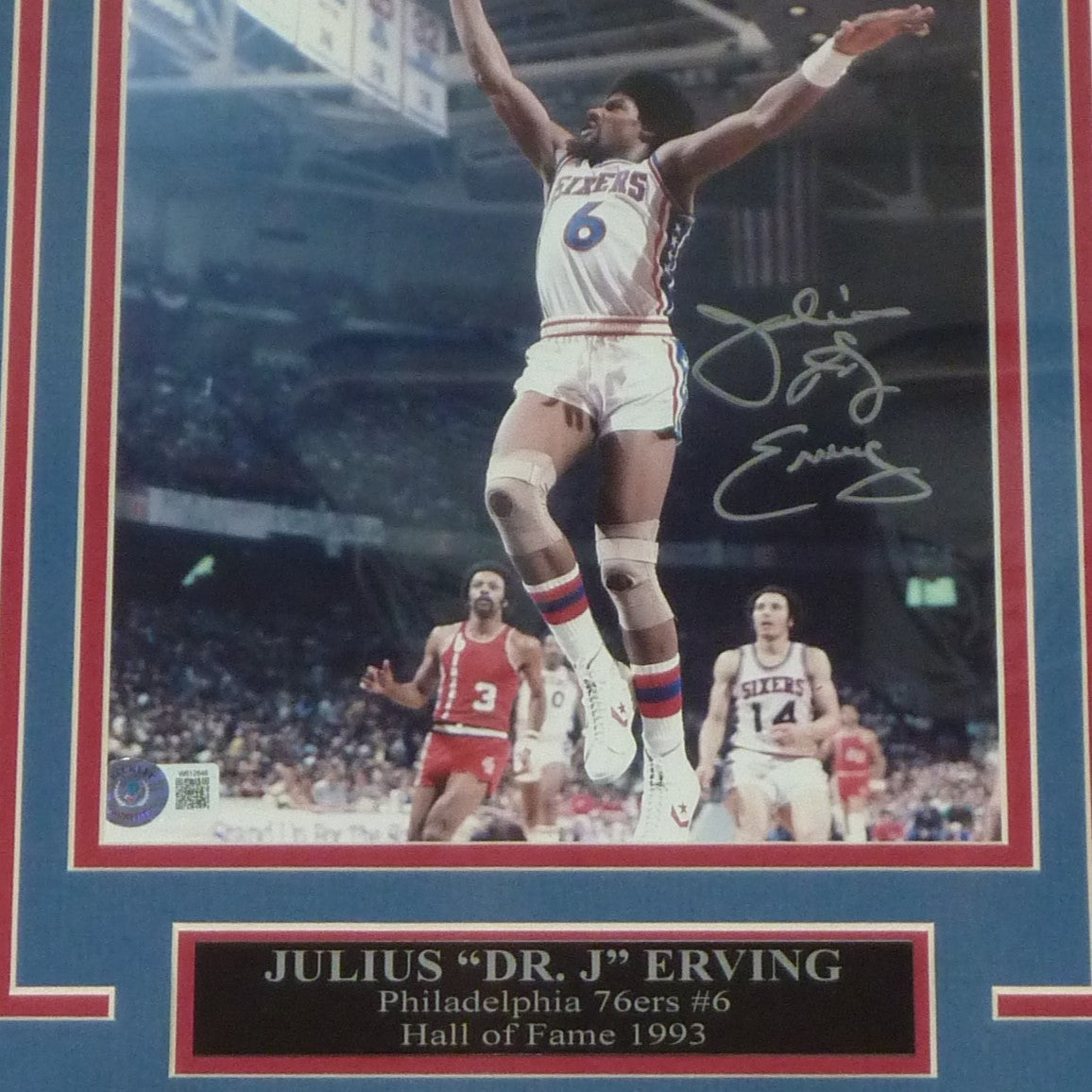 Experience the thrill of owning a piece of basketball history with this autographed Julius "Dr J" Erving 8x10 photo. This deluxe framed photo captures the dynamic energy of the Philadelphia 76ers legend and comes with a Beckett authentication, guaranteeing its authenticity. Perfect for any fan or collector.