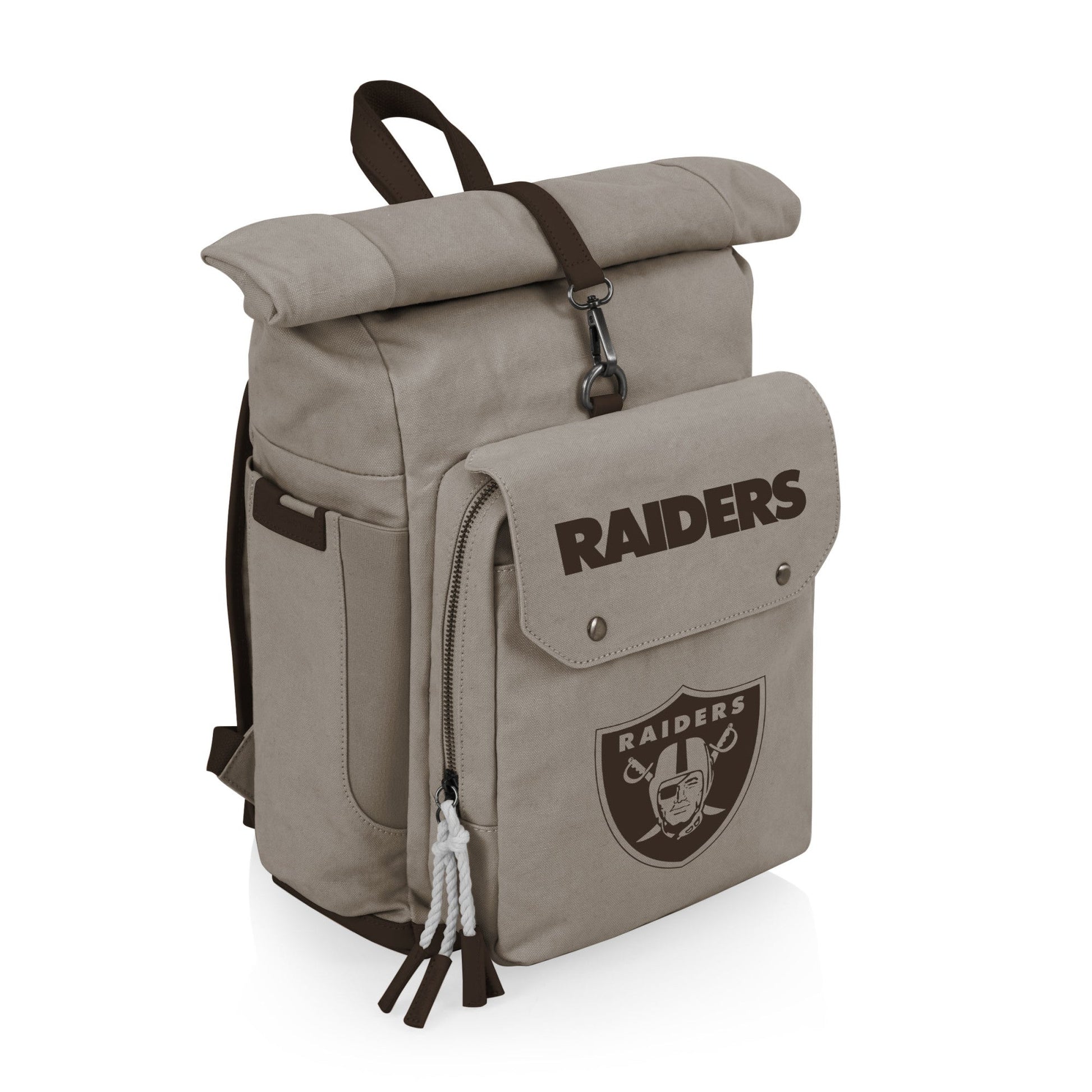 The Las Vegas Raiders Carmel Roll Top Picnic Backpack Cooler brings together a certified recycled Cotton canvas exterior with a waterproof, insulated, eco-friendly interior to create one stylish and functional package. But wait - that’s not all! The component pocket in this soft cooler bag can easily store all the picnic accessories you need for a true portable party, the roll top provides even more space for snacks and beers, and the durable bottom helps keep everything in this outdoor cooler dry. Truly an outdoor concert and travel essential, the front slip pocket with key loop, magnetic top closure, and security pocket on the back keep your valuables safe yet accessible in a crowd. Classic good looks AND highly functional design? If it was your date, it would be too good to be true - but luckily, it’s a backpack cooler.