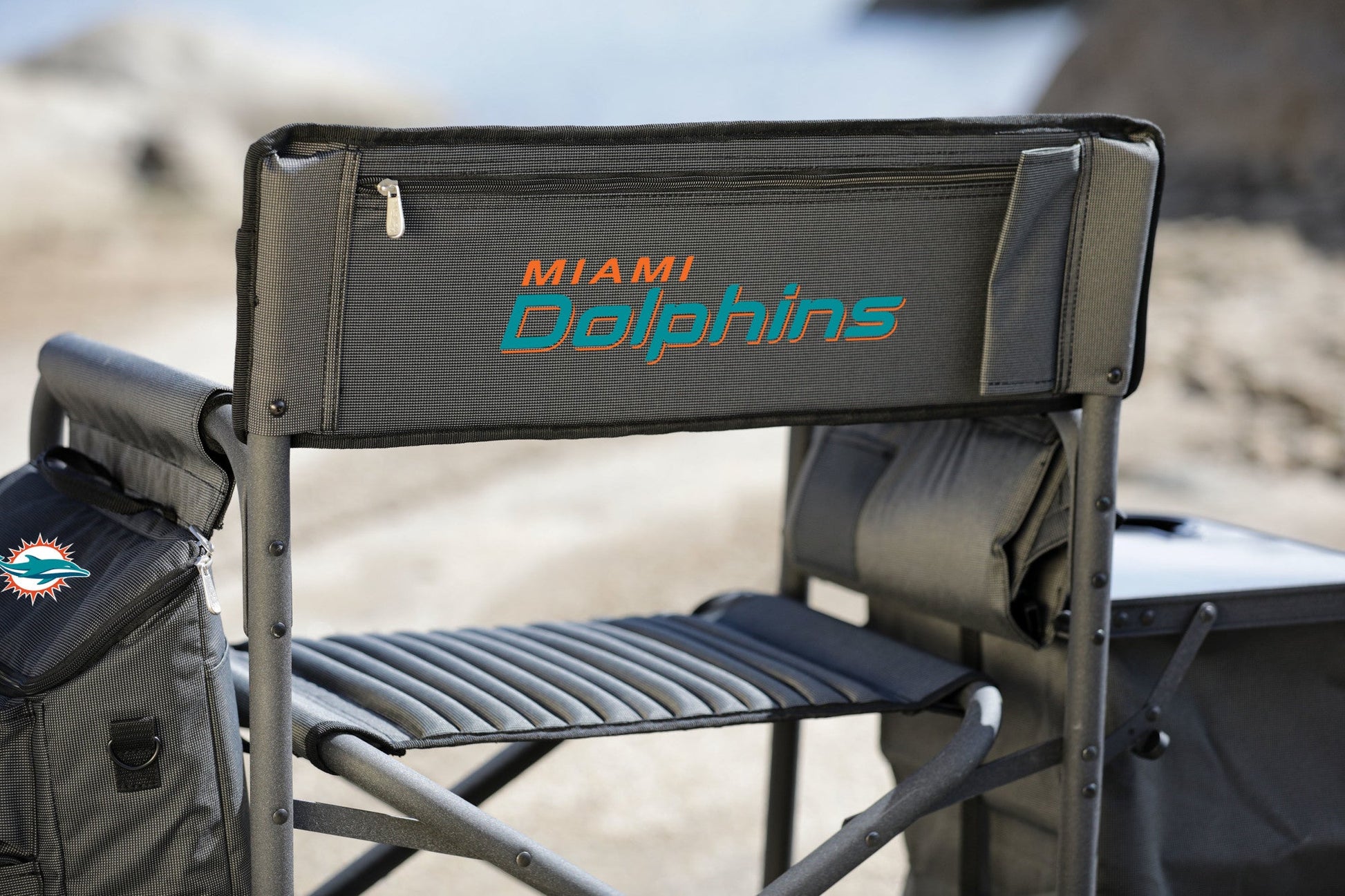 The Miami Dolphins Fusion Camping Chair is a heavy duty portable camp chair with so many features, you might make it your new office! A durable, powder-coated aluminum frame and ribbed padding in the seat and back rests is only the beginning - this outdoor chair with table on the right side also includes a two-tiered, accordion-style shelves hanging below, plus a side-mounted, fully-detachable 24+1-can-capacity cooler with its own backpack straps, a cell-phone-specific pocket, specialized fabric loops for an umbrella or sports banner, and numerous pockets. Show off your team spirit everywhere you go with this chair, adorned with your favorite team's logo across the back and cooler. The Fusion is more than an outdoor portable chair, it's a camp chair, a beach chair, and heck - a lawn chair relaxation throne. All that and it’s still lightweight enough to be easily portable yet strong enough to hold up to 350 lbs?! This is an outdoor directors chair that never disappoints.