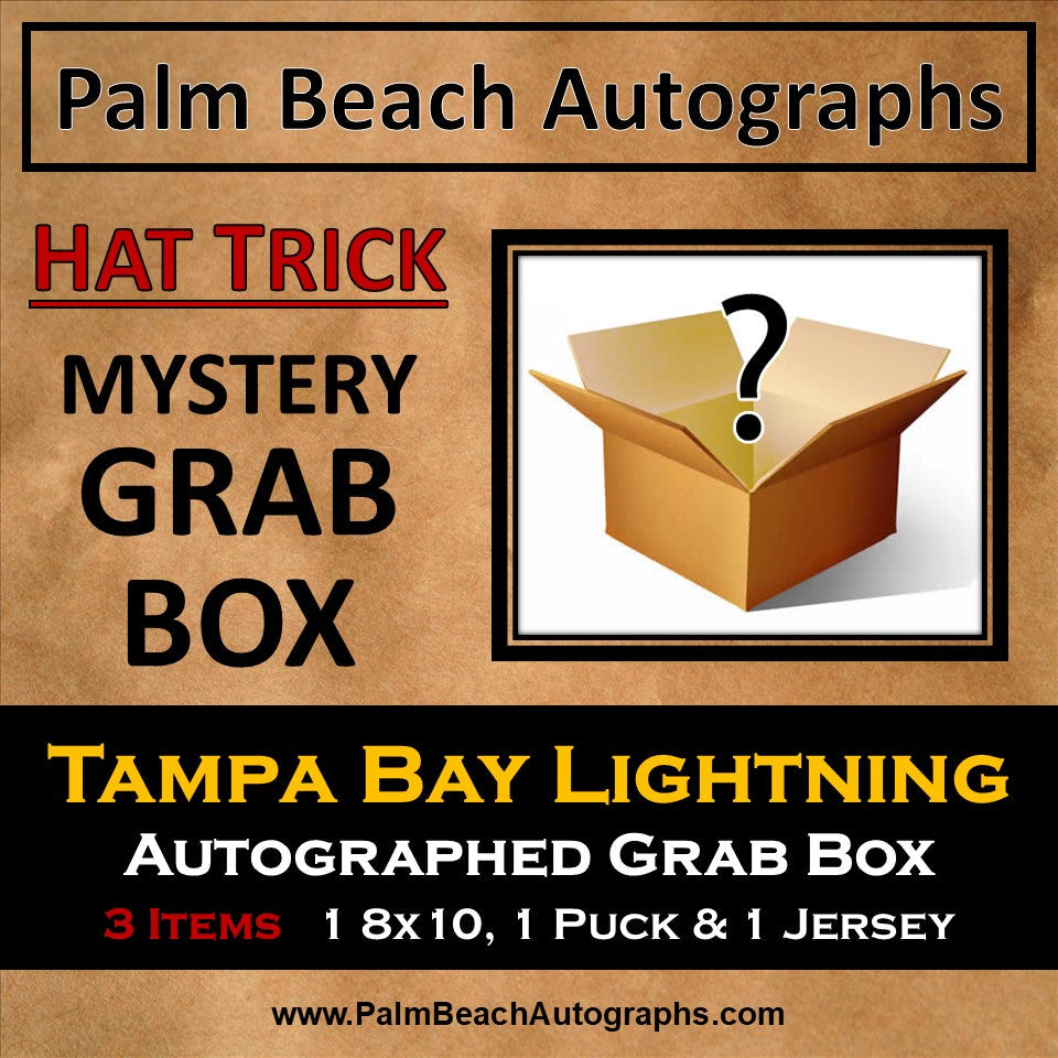 We introduced our "Mystery Grab Bag" program in our retail stores in 2012 and the response has been overwhelming. Due to popular demand, we are now offering these items online. Each Grab Bag is sealed and will contain one autographed custom stitched Jersey, autographed puck, and autographed 8x10 of a past or present Tampa Bay Lightning hockey player. It will be accompanied by a Palm Beach Autographs hologram and Certificate of Authenticity. For in-store purchases you will be able to select your own Grab bag, but for online purchases it will be selected at random by a member of our staff. No returns or exchanges on Grab Bags. Good luck!!