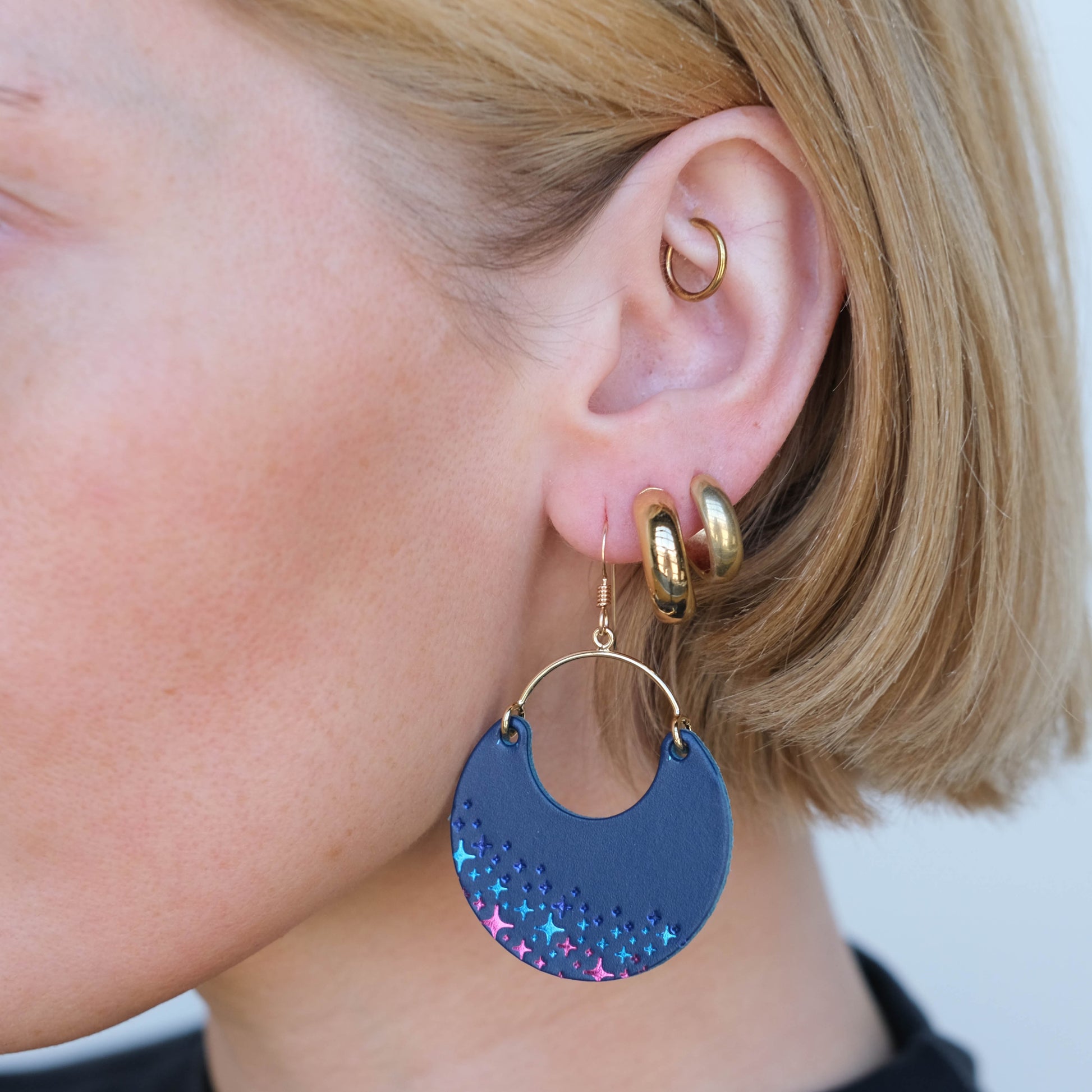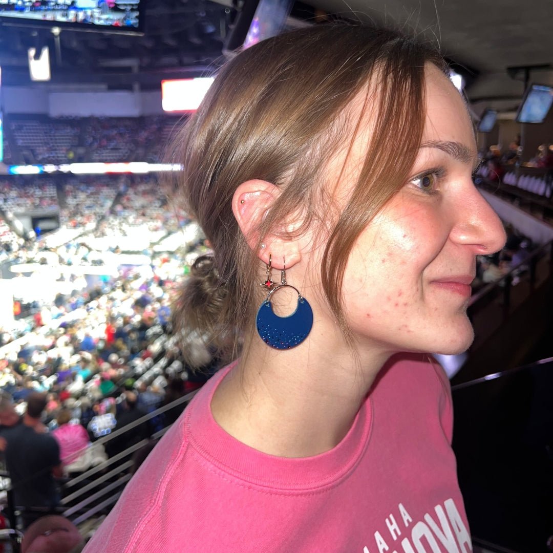 Elevate your game day look with our Navy Supernovas Sparkle Ninas. A cute and chic game day earring that's perfect for showing off your team spirit in style. These Navy hand foiled leather earrings are a subtle nod for showing off your team spirit in style.