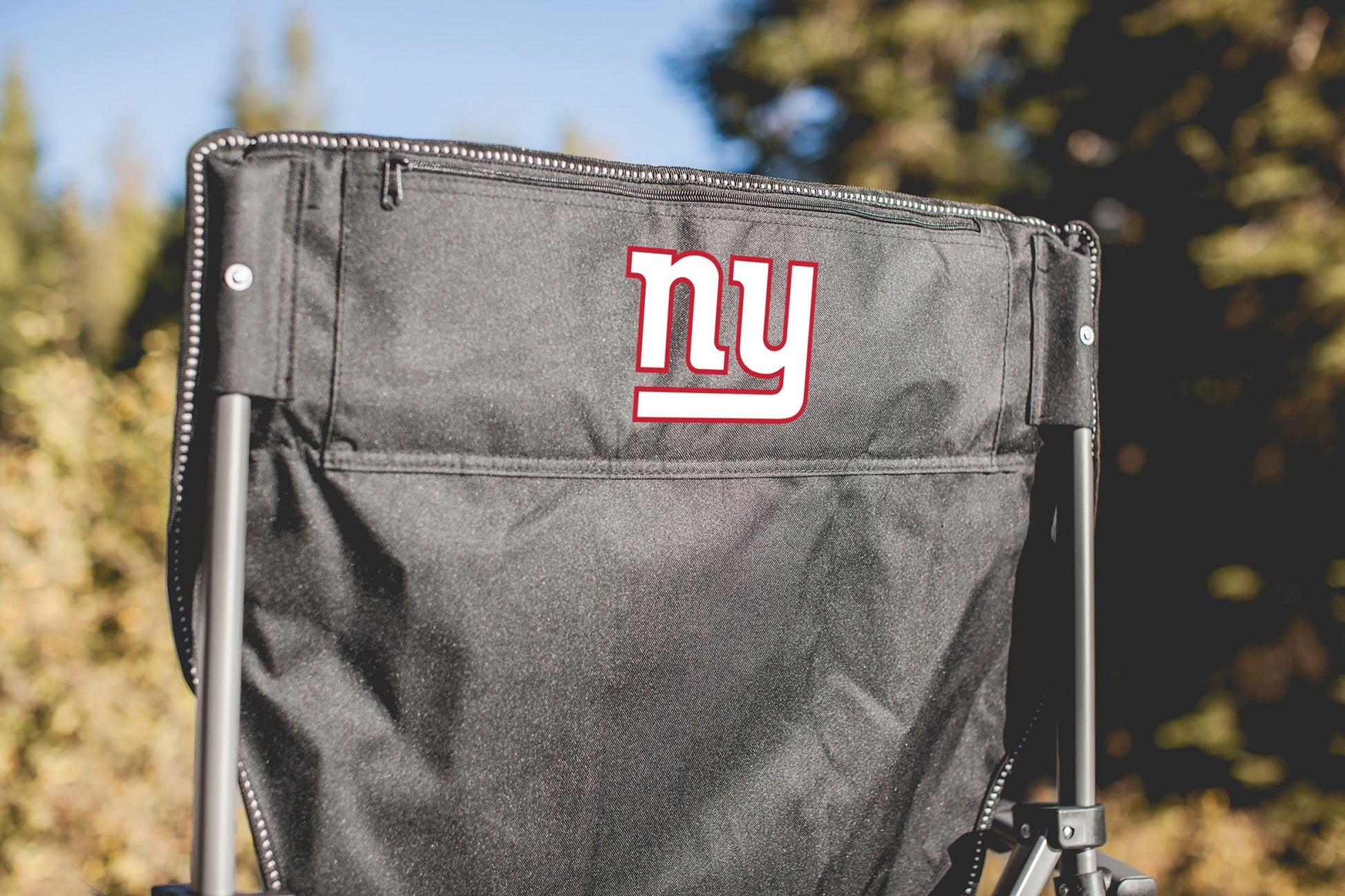 The New York Giants Outlander XL Camping Chair with Cooler is a heavy duty beach chair with drink holder, cooler, and easy carry transport bag. This sturdy steel frame folding lawn chair features hinged feet for stability on uneven terrain, durable polyester canvas construction, and a 9-can-capacity cooler and drink holder that attach to the chair so your drinks are always within reach. Perfect for camping, picnicking, and tailgating, this portable outdoor chair packs into a drawstring tote with a shoulder strap and features a zippered security pocket behind the headrest. With a 400lb weight capacity, it’s a durable adult camping chair for everyone. Get a big value with a big folding sports chair. He ain’t heavy - he’s my camp chair!