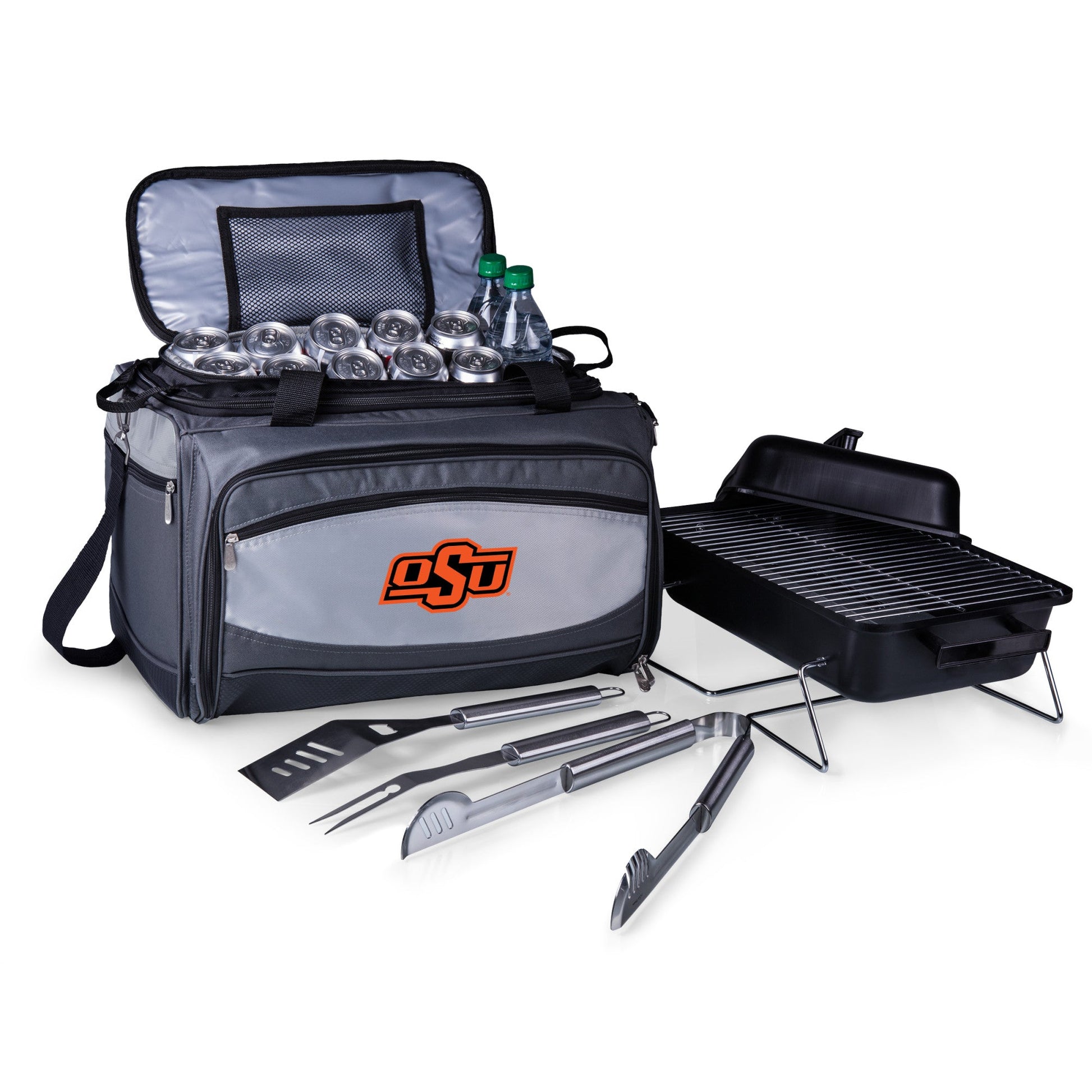 Picnic Time is proud to introduce our patented Oklahoma State Cowboys Buccaneer Portable Charcoal Grill & Cooler Tote, a travel grill set and insulated cooler in one! A 24-can capacity, fully-removable cooler nestles securely into the main compartment which holds the bbq grill and lid, and an exterior zip-up compartment holds three stainless steel grilling tools with aluminum handles and non-slip thumb grips including: one large spatula with an integrated bottle opener, one bbq fork, and tongs. With an adjustable shoulder strap with comfort pad, a reinforced waterproof base, three large zippered exterior pockets to store personal effects, padded carry handles, and a stretch cargo cord on the top of the tote to carry a blanket or towel, you'll win the tailgate party, hands down!