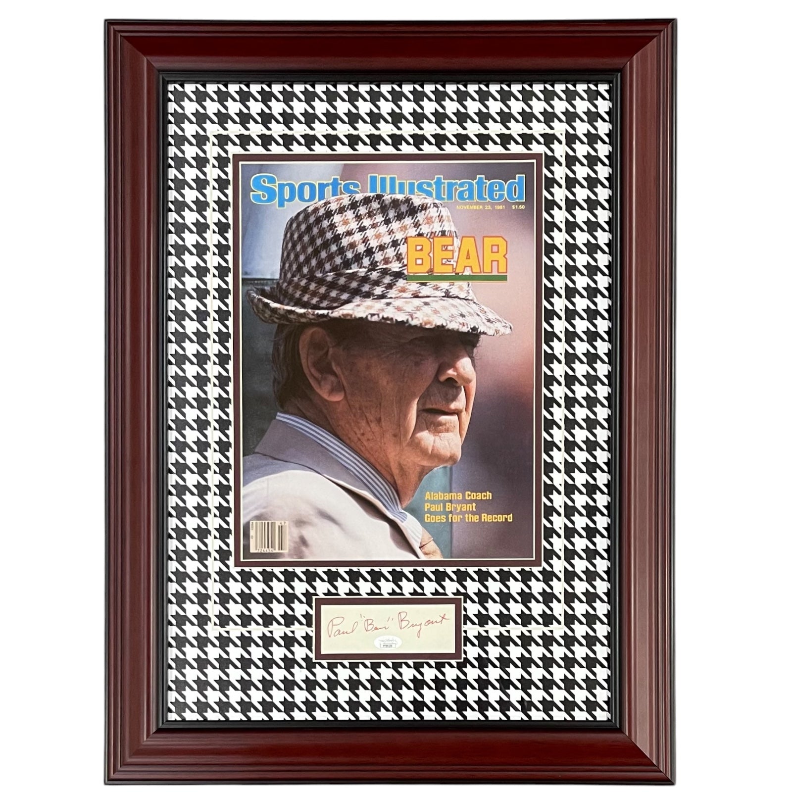 This framed 11x14 Sports Illustrated, signed by legendary coach Paul "Bear" Bryant, is a must-have for any Alabama Crimson Tide fan. With a certificate of authenticity from JSA, this piece of memorabilia is a true collector's item. Show off your team pride and honor the legacy of one of the greatest coaches in college football history.