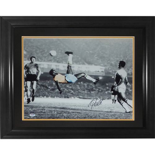 Experience the magic of soccer with our Pele Autographed Brazil Soccer framed photo. This stunning 16x20 photo captures Pele's iconic Bicycle Kick in the spotlight, personally signed by the legend himself and certified by PSADNA. A must-have for any fan or collector. Own a piece of history today!