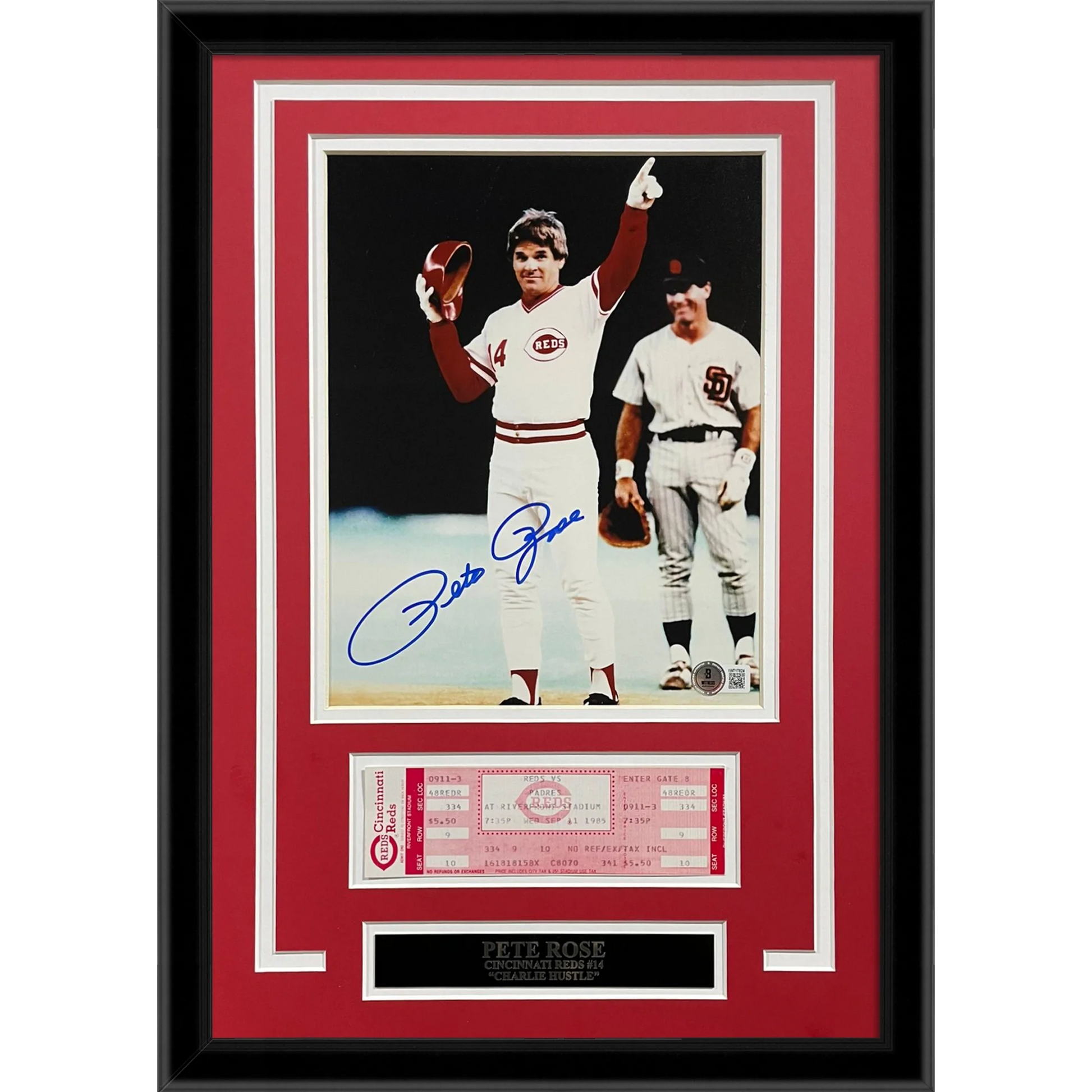 Own a piece of baseball history with this autographed 8x10 photo of Pete Rose's historic 4192 hit with the Cincinnati Reds. The photo comes beautifully framed with a replica game ticket, certified by JSA. Show your love for the game and add this collector's item to your collection today!