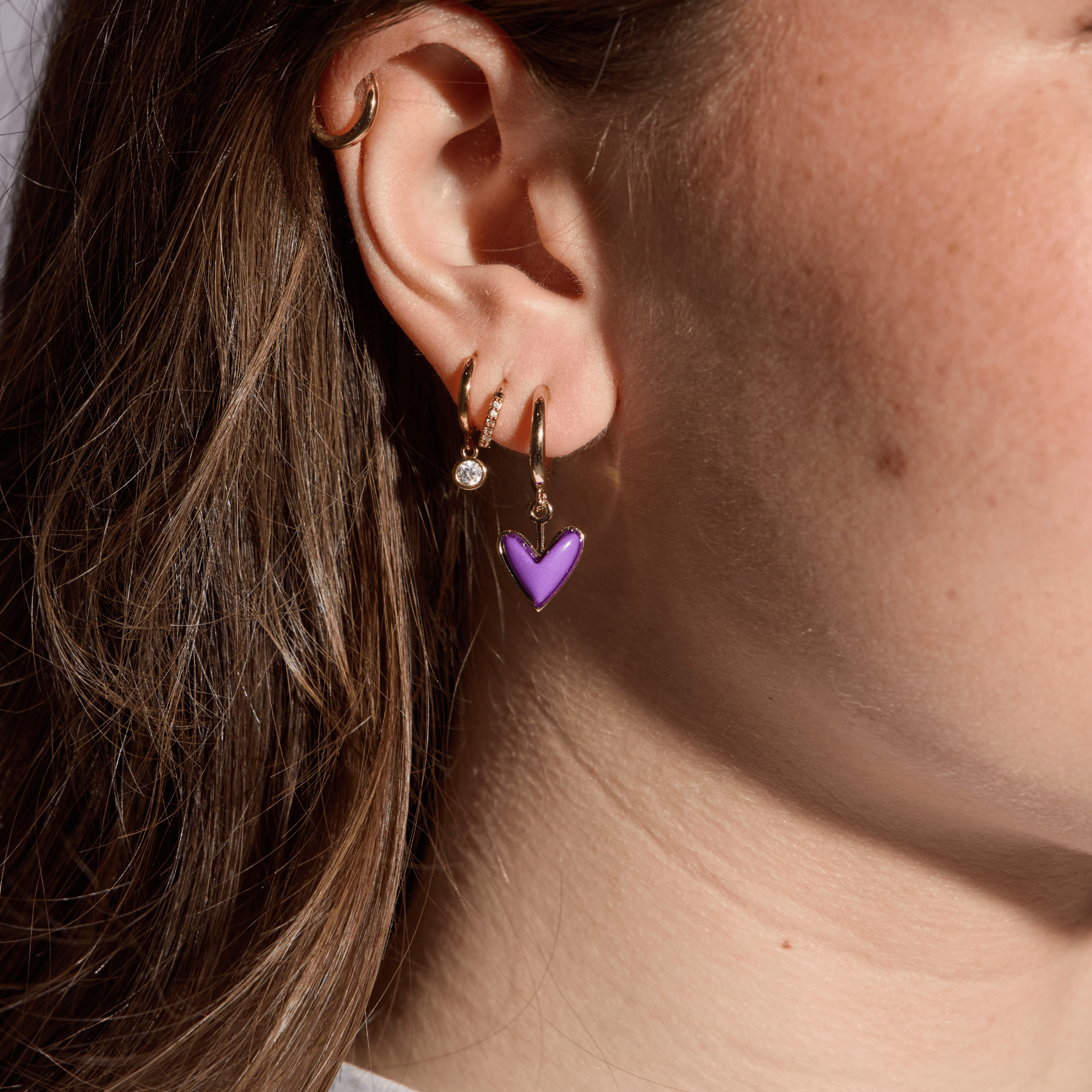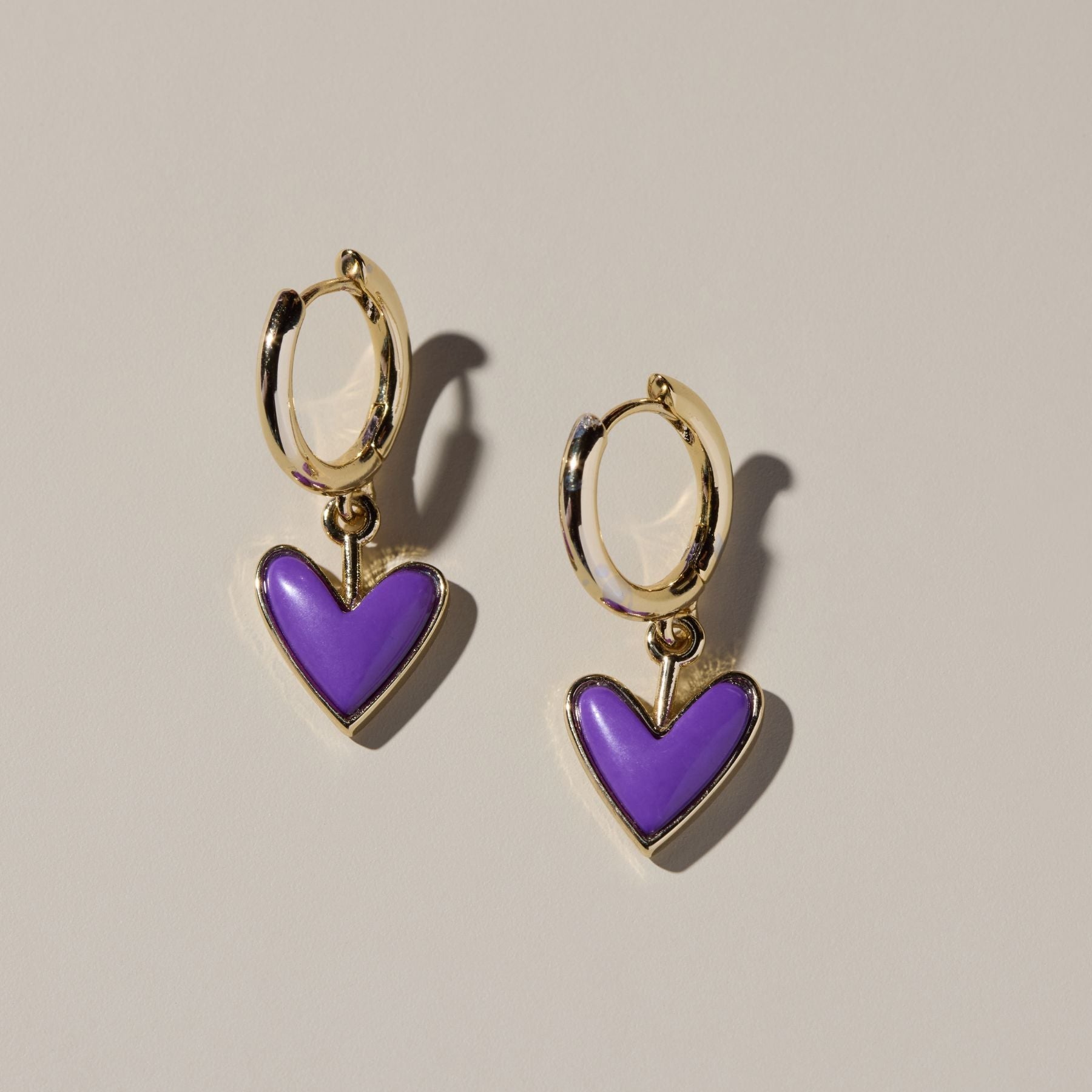 On-trend sweetheart huggies are ideal for mixing and stacking. Inspired by their namesake statement earring, these petite hoops feature a hanging purple stone charm in gold plating over brass with a hinged closure.