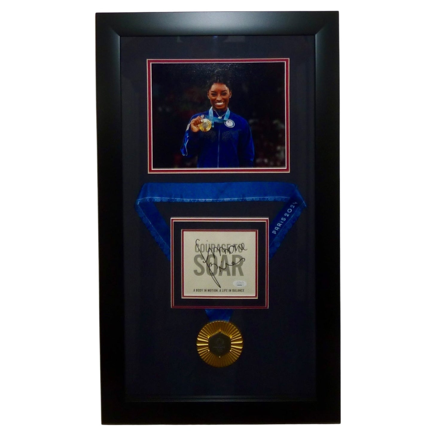 Own a piece of history with this Simone Biles Autograph Deluxe Framed set, including a replica Paris Olympics Gold Medal and 8x10 photo, authenticated by JSA. Perfect for any sports fan or collector, this set showcases the skill and determination of one of the greatest athletes of our time!