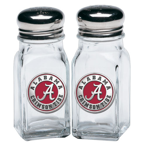 This is a set of salt & pepper shakers with a fine pewter logo medallion bonded to the side. Made in USA.