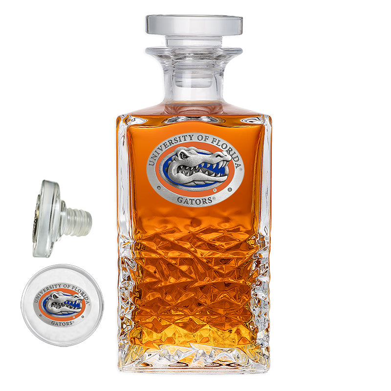 This 25 ounce glass decanter is embellished with a fine pewter casting. Be sure to match it with some of our Double Old Fashioned glasses. A great addition to any home bar!
