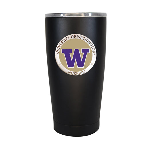 This 15 oz double wall stainless steel (no handle) travel mug is insulated and it is stainless inside and out. It is embellished with a fine pewter decorative casting. The lid has a non-spill feature. The absence of a handle makes it perfect for you car's drink holder.