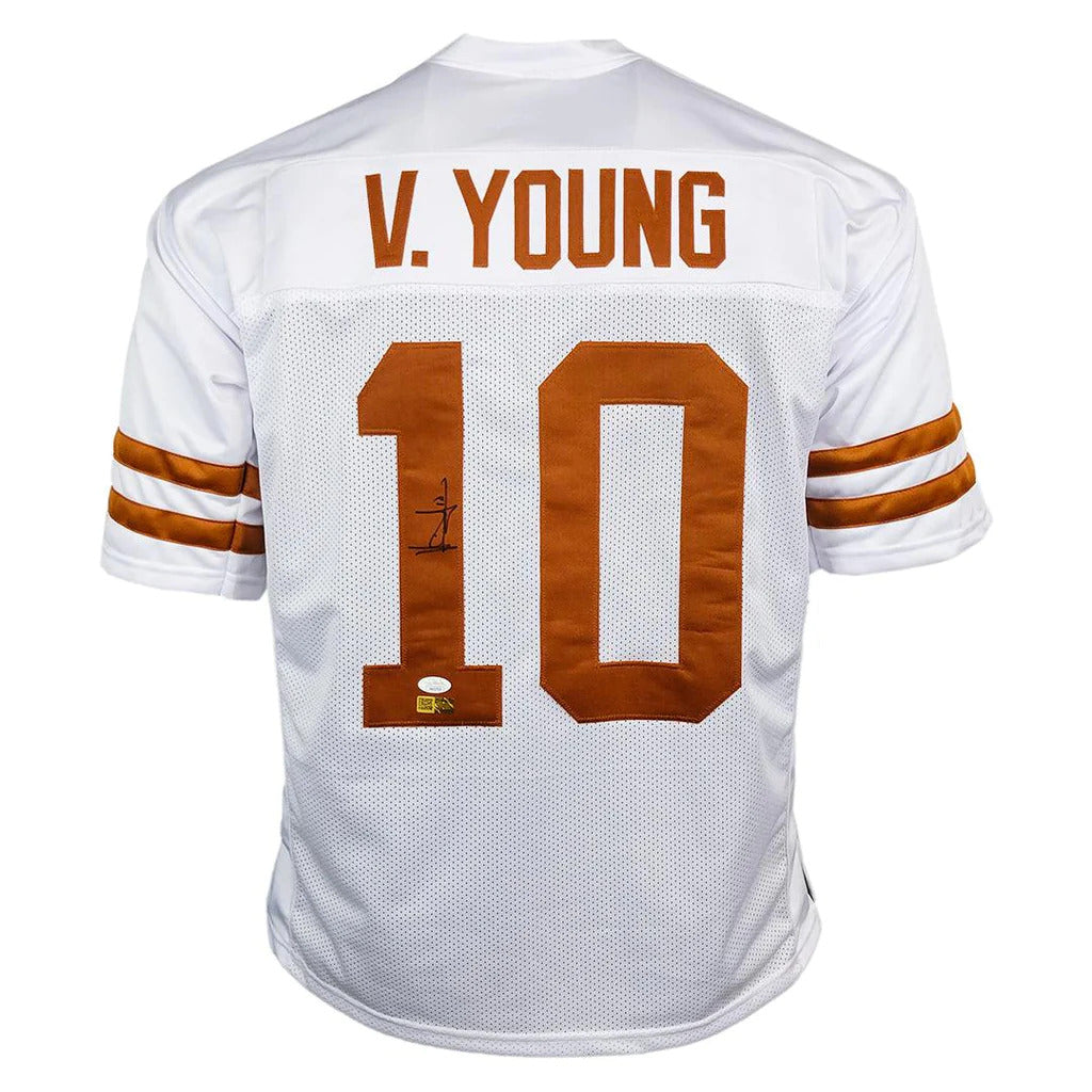 Show your love for the Texas Longhorns with an autographed Vince Young #10 Custom Jersey! This jersey, personally signed by Vince Young himself and verified by JSA, is a must-have for any fan or collector. Own a piece of history and display your team pride with this special jersey!